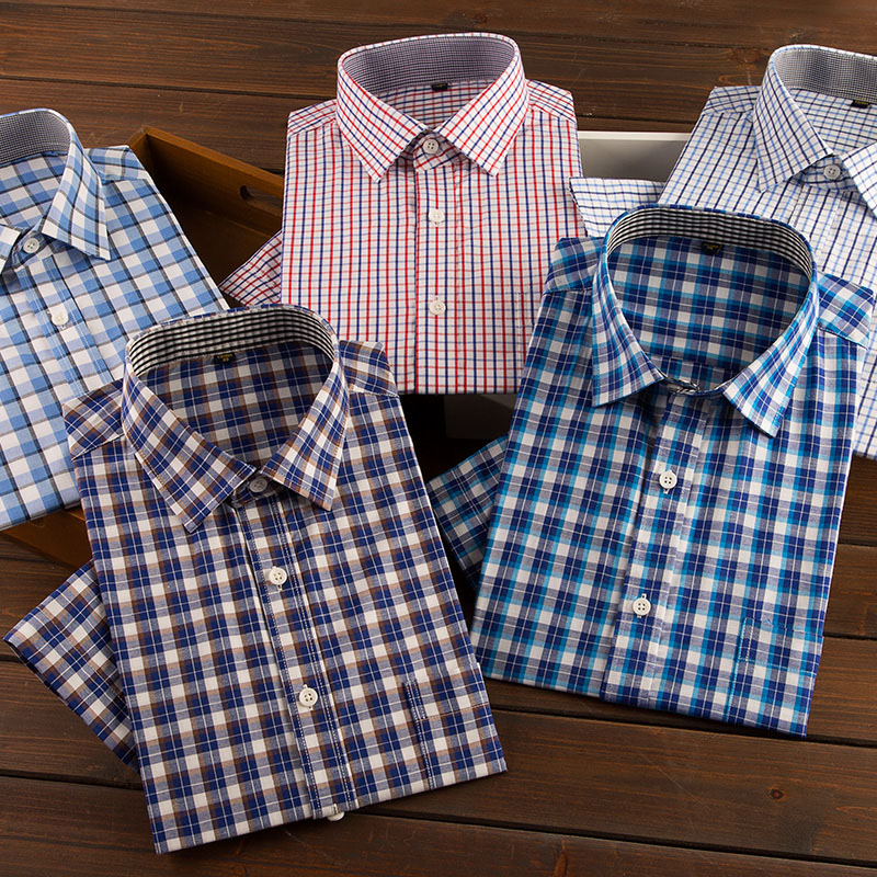 夏季小藍格子短袖襯衫男士商務休閑工裝半袖襯衣白底藍條免燙寸衫