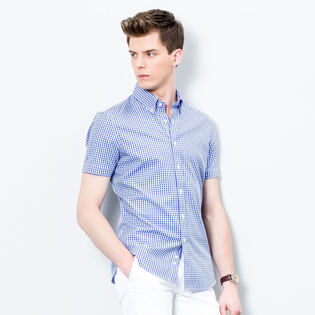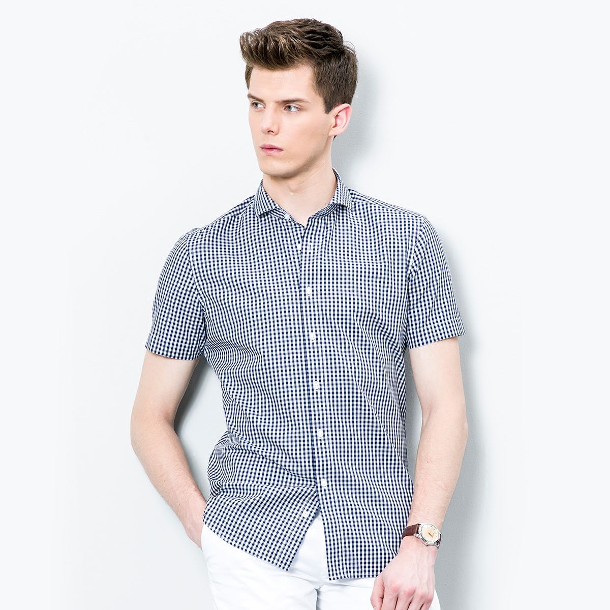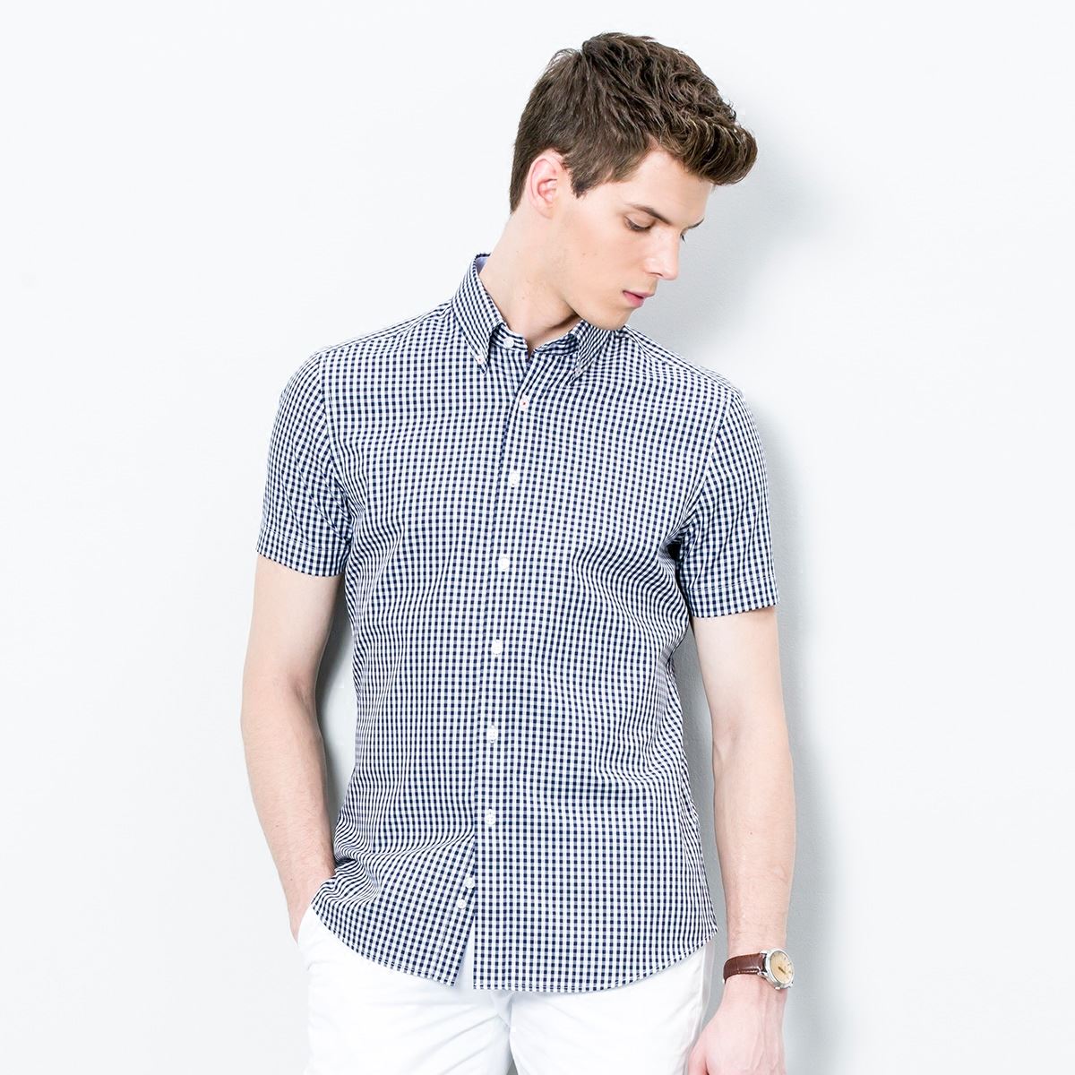 / 夏季新款藍白細格子寸衫男短袖襯衫韓版修身薄款純棉深海襯衣