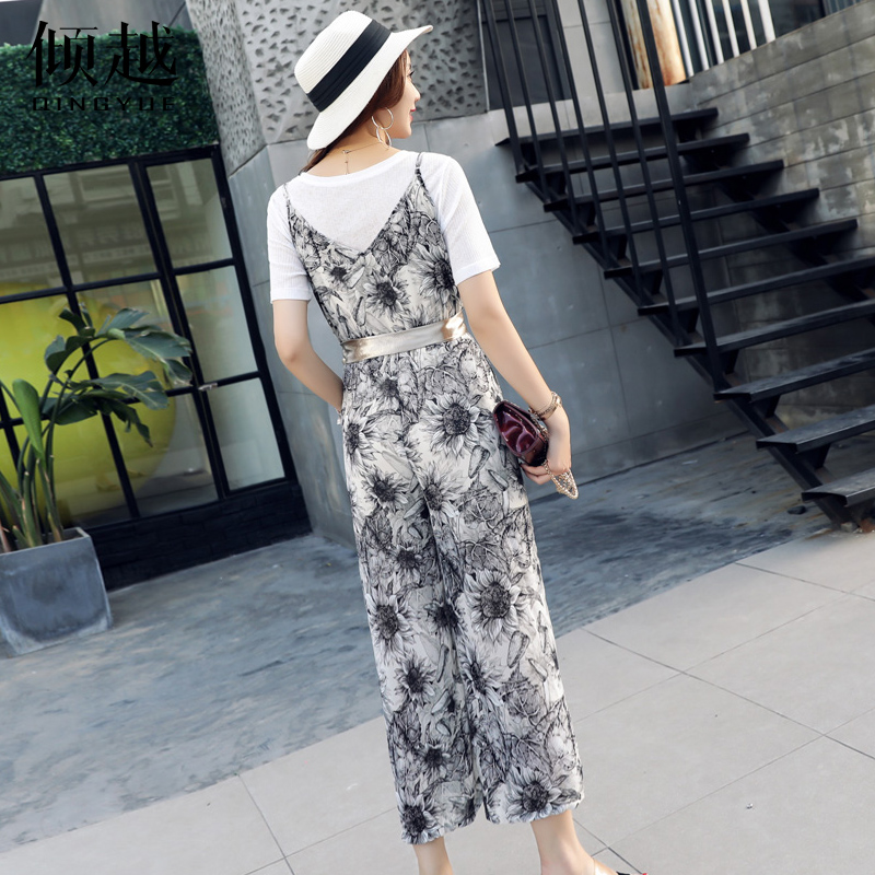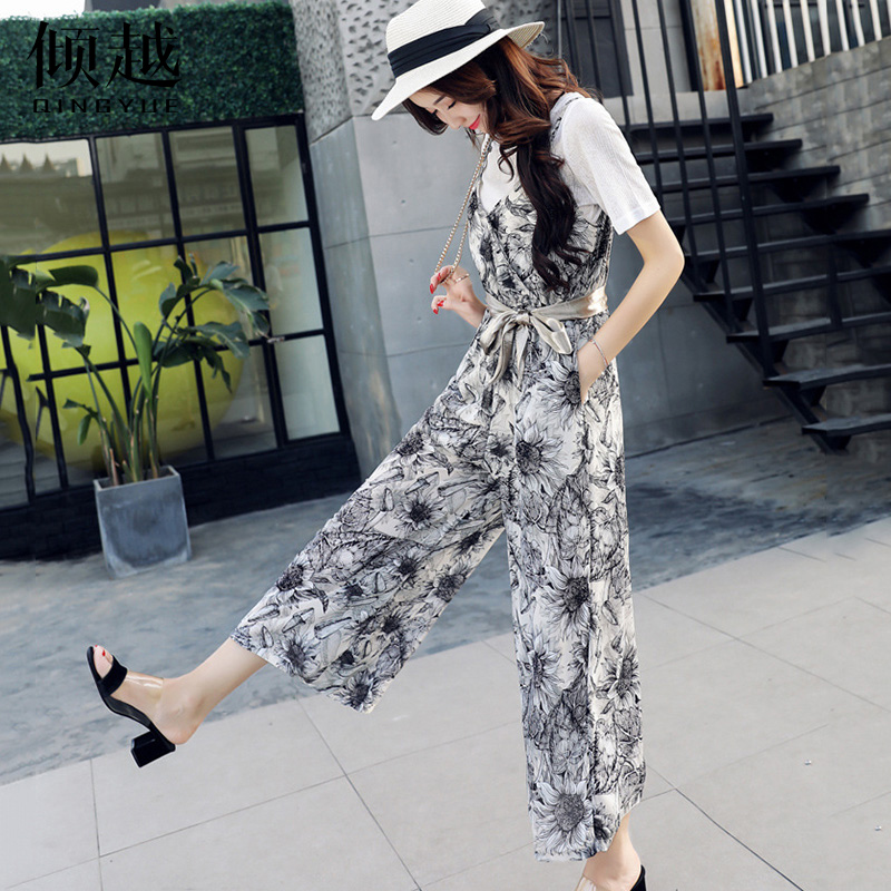 / 套裝裙女2017夏裝新款韓版吊帶高腰碎花連衣裙短袖T恤時尚兩件套