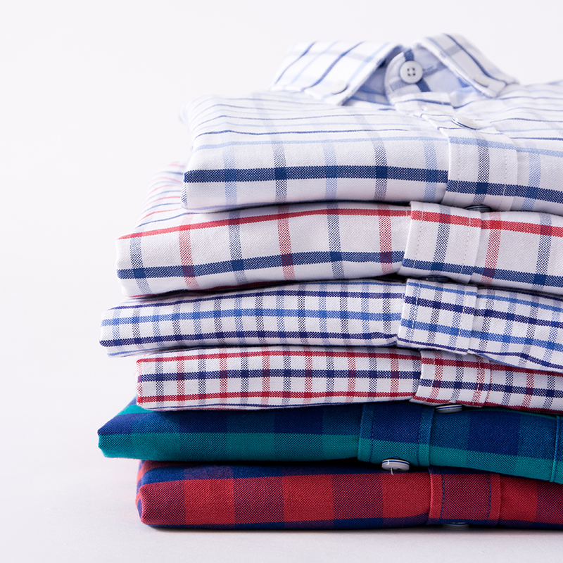 / 春裝全棉牛津紡扣領男士襯衫商務休閑長袖純棉修身青年格子襯衣潮