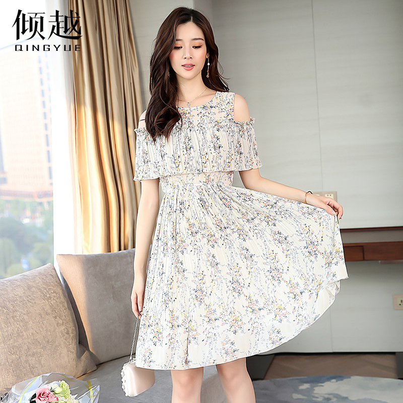 / 2017夏季新款韓版收腰甜美印花雪紡連衣裙露肩百褶小清新碎花裙子