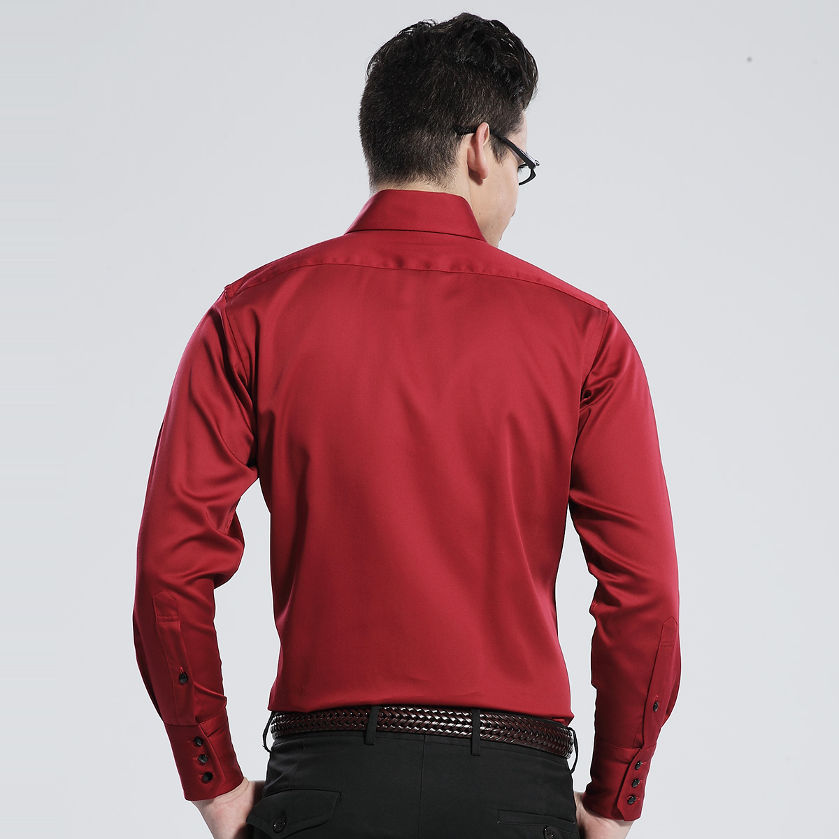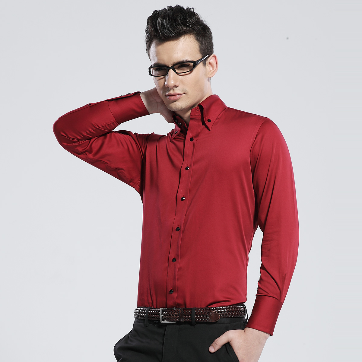 / 深海男士韓版絲光棉修身酒紅色襯衫男長袖襯衣新郎結男裝禮服潮