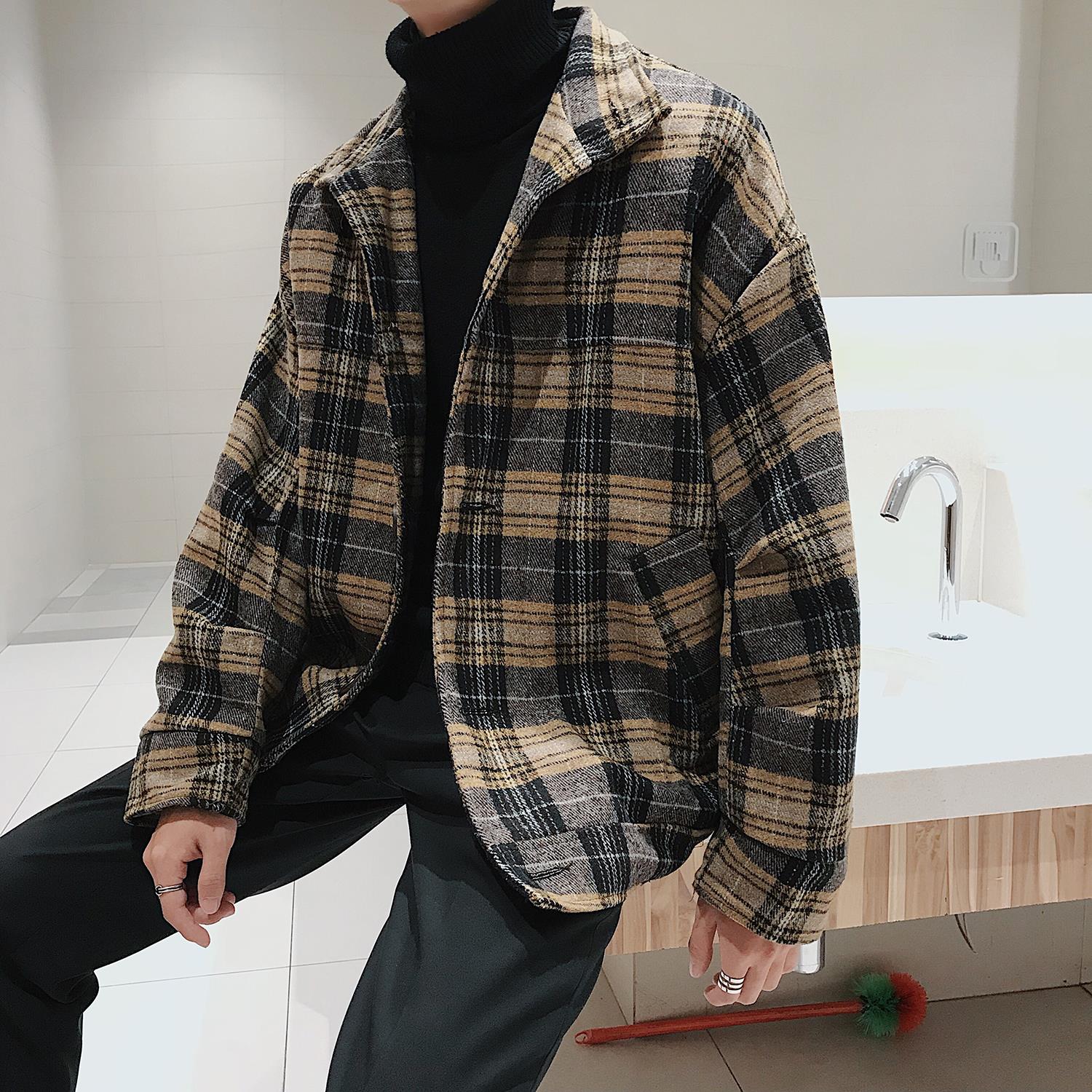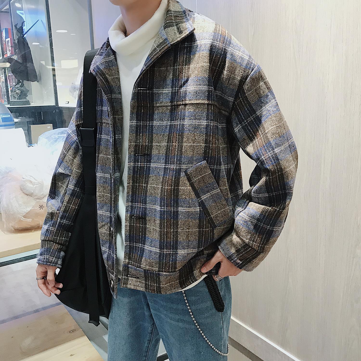 / 文藝男女店短款秋冬寬松毛呢大衣韓版男士潮流格子英倫風冬季外套