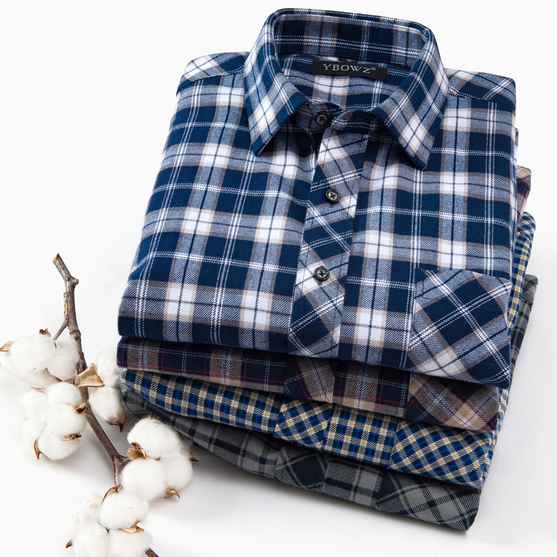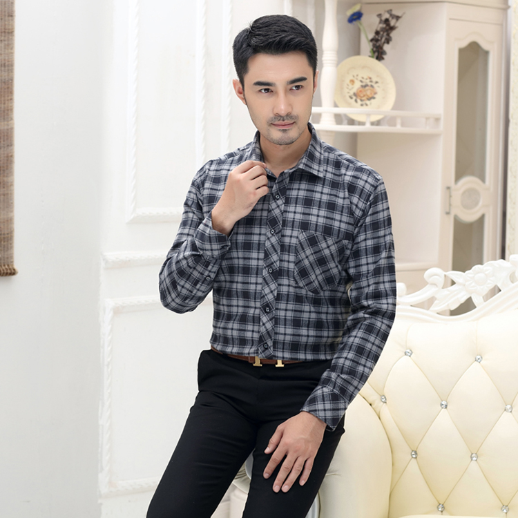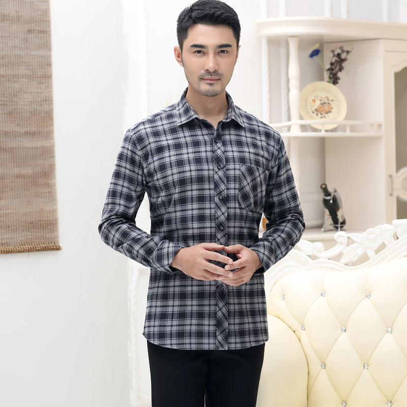 / 春秋全棉男士長袖襯衫寬松純棉休閑襯衣中老年磨毛格子襯衫法蘭絨