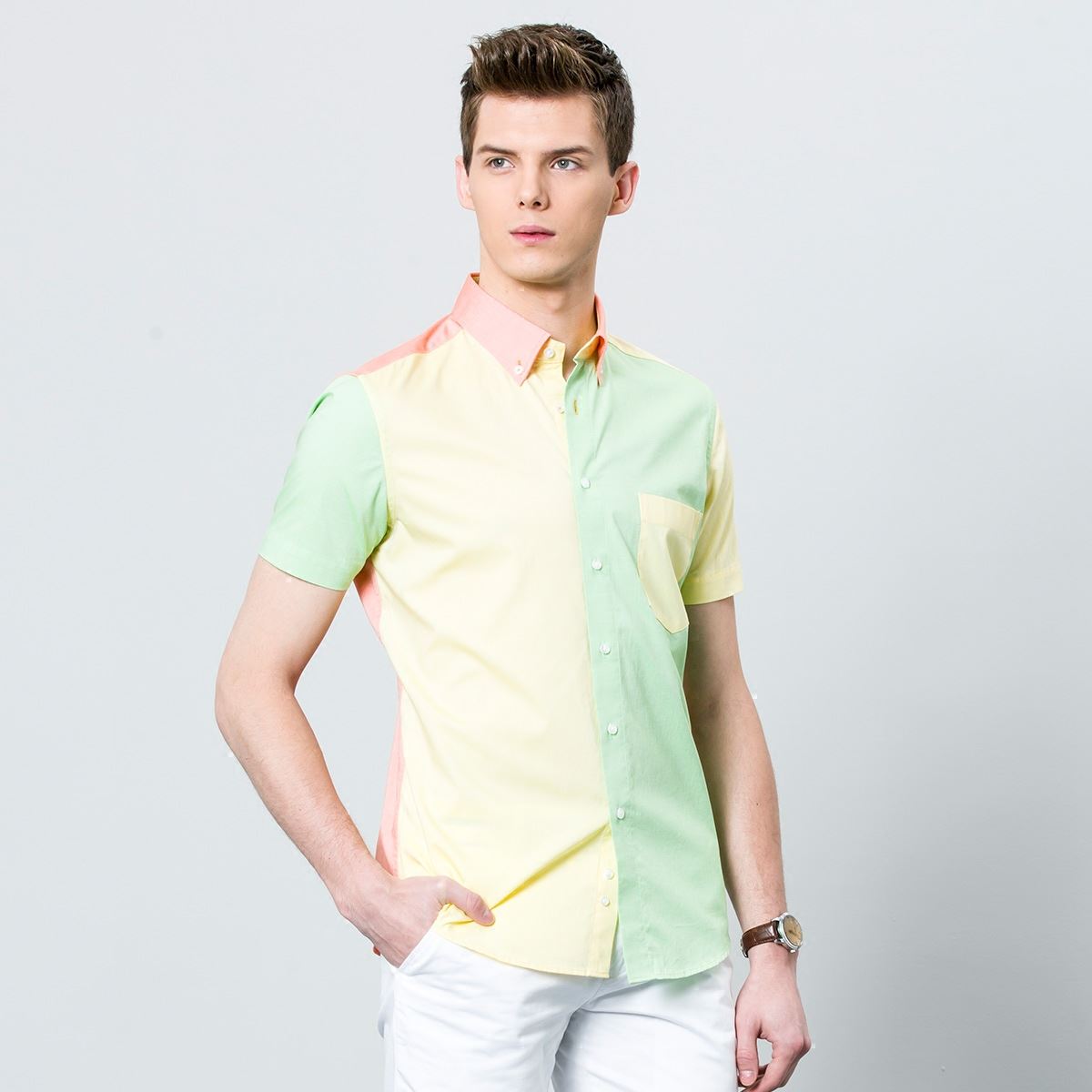 / 新款夏季男短袖襯衫時尚拼接修身純棉舒適牛津紡新品半袖襯衣