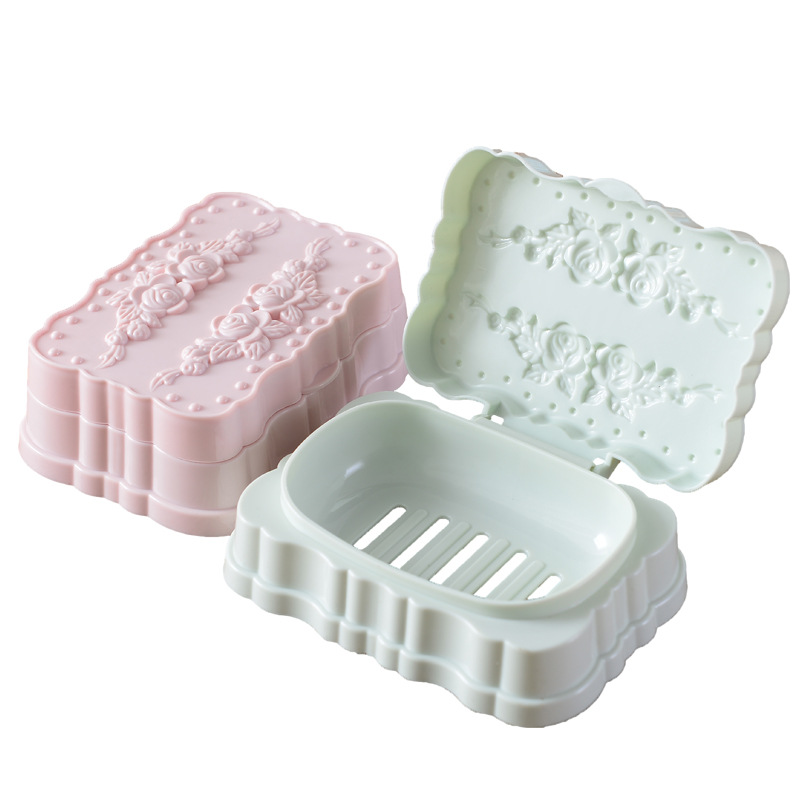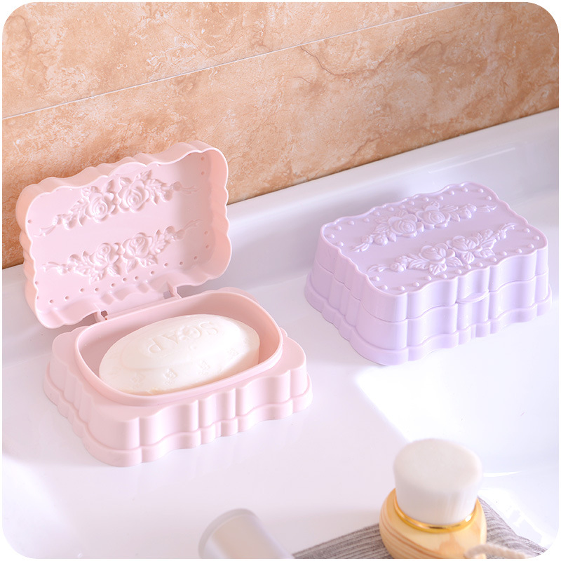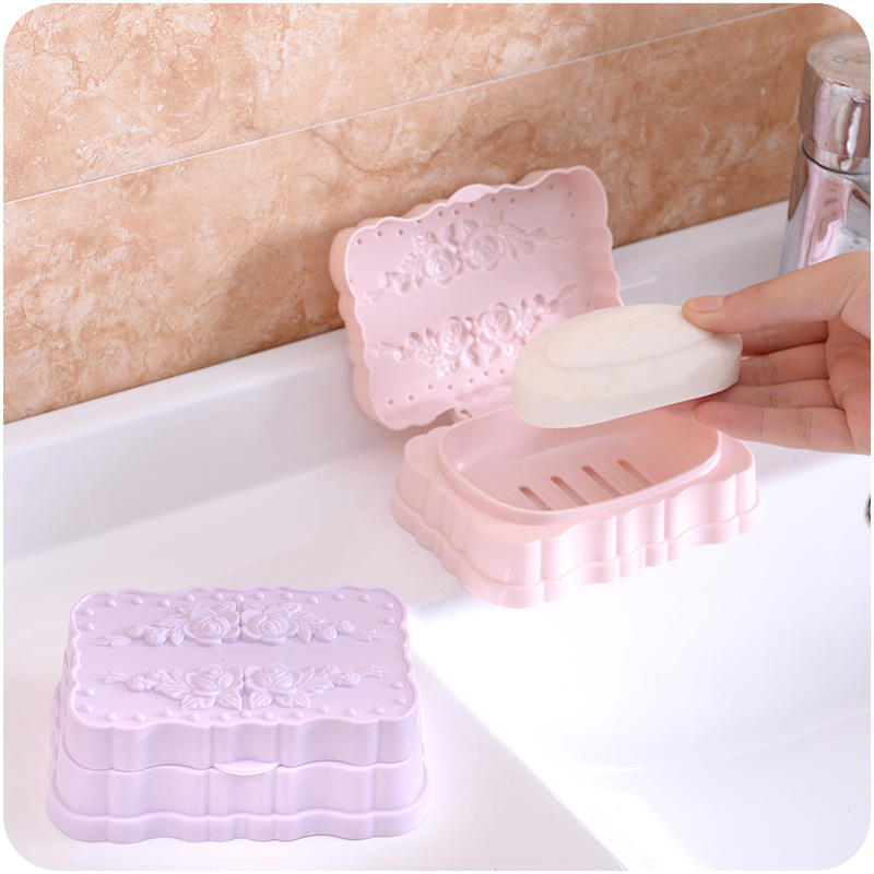 / 立體花朵香皂盒 創意 浴室瀝水塑料帶蓋肥皂盒 家庭用薔薇花旅行
