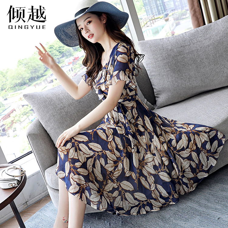 雪紡連衣裙短袖女夏裝氣質韓版修身顯瘦2017新款碎花中長款長裙子