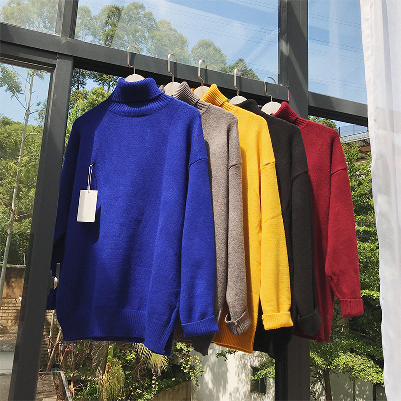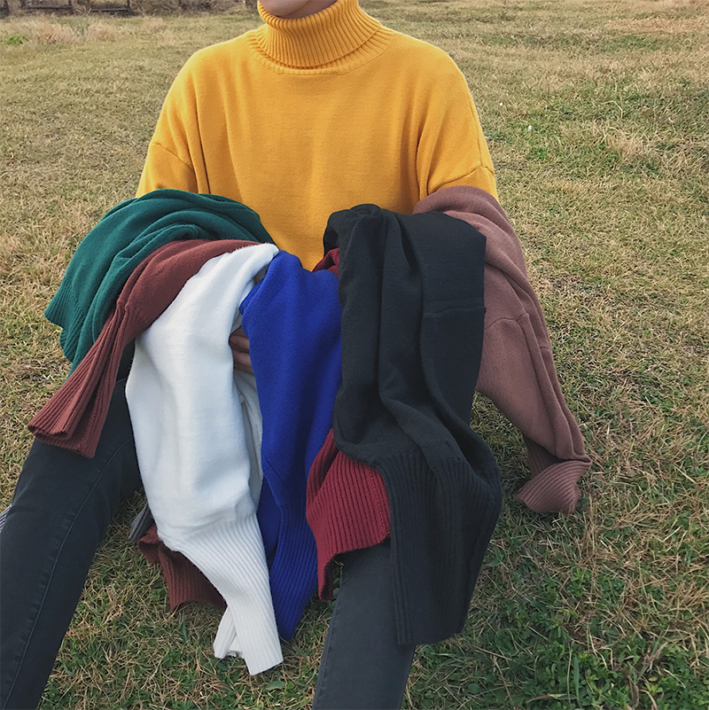 文藝男女店秋季男士寬松高領毛衣韓版潮流套頭純色針織衫原宿風