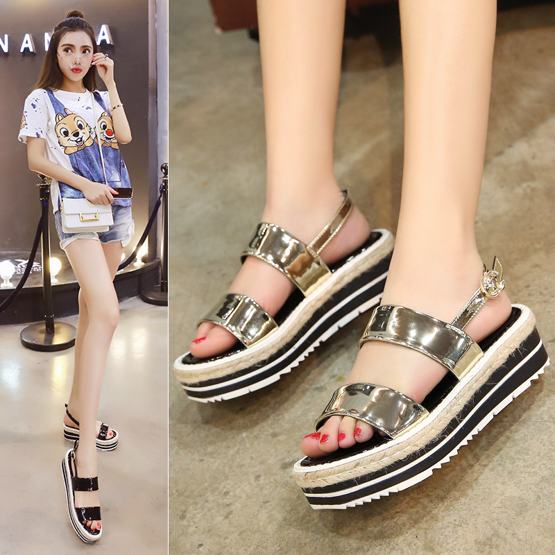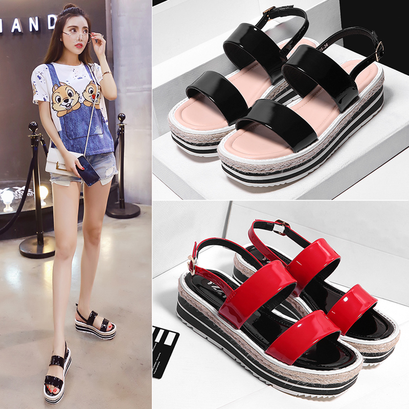 / 厚底松糕涼鞋女夏新款學生休閑粗跟平底中跟一字扣羅馬女涼鞋