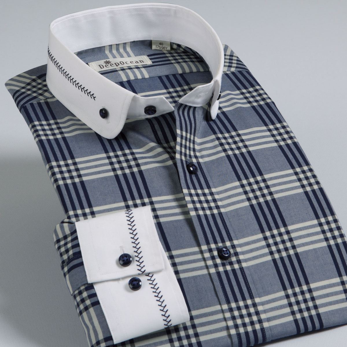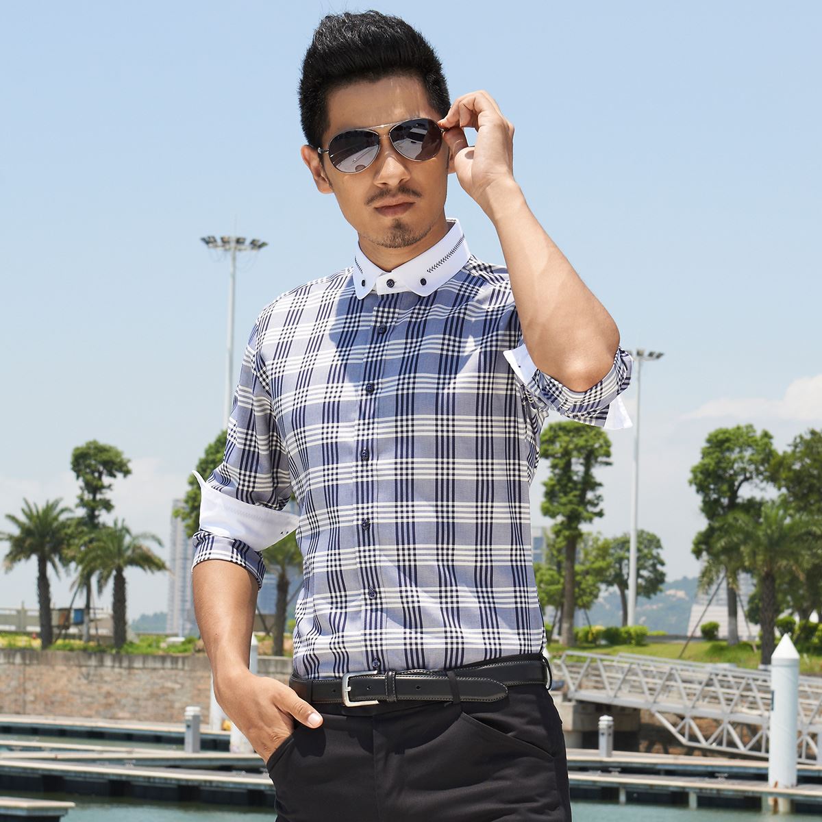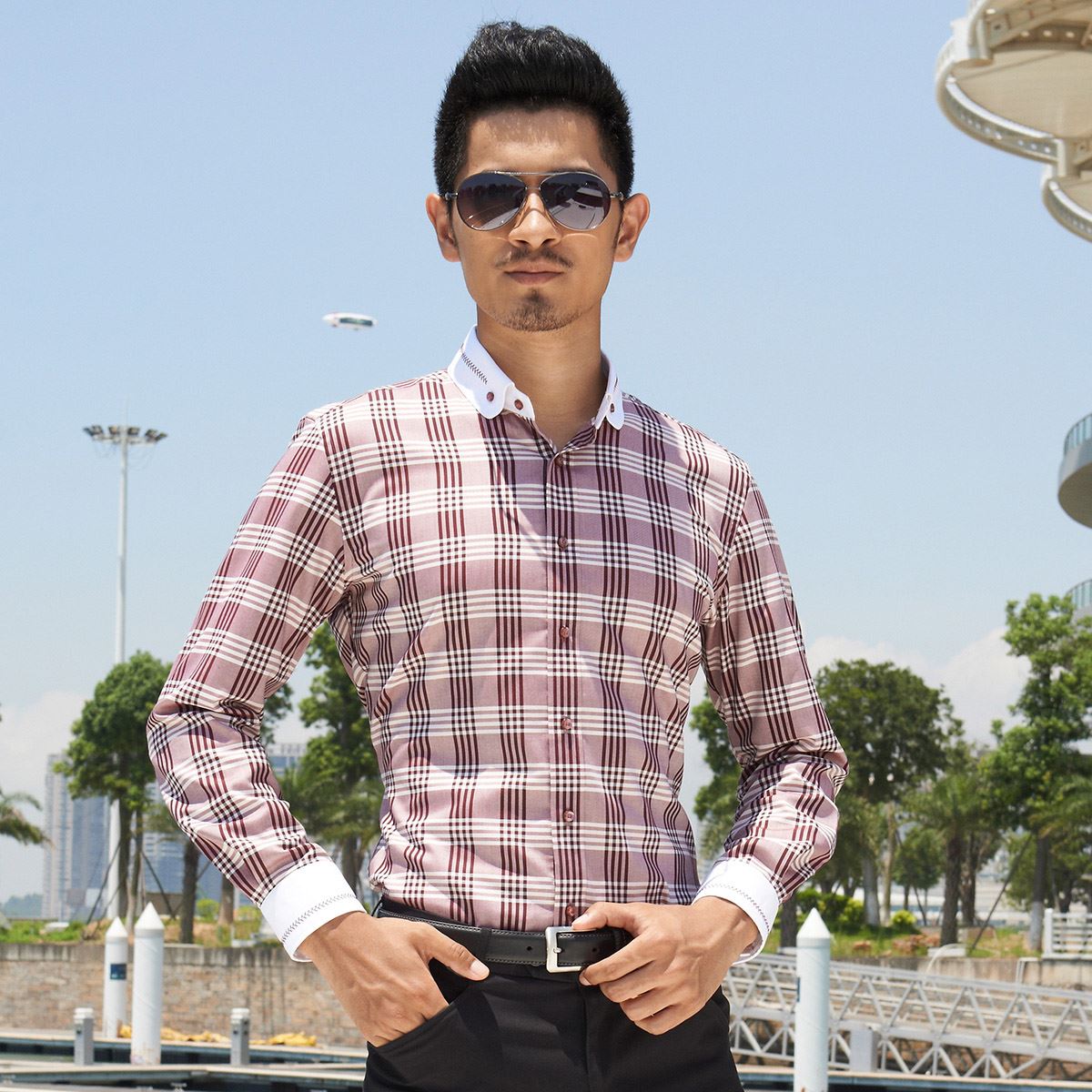 / 小格子襯衫男長袖 深海撞色拼接修身時尚休閑襯衣韓版男裝 紅格子