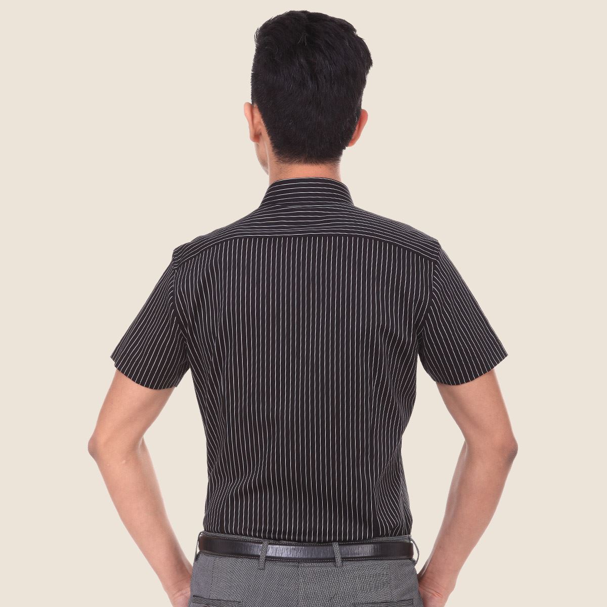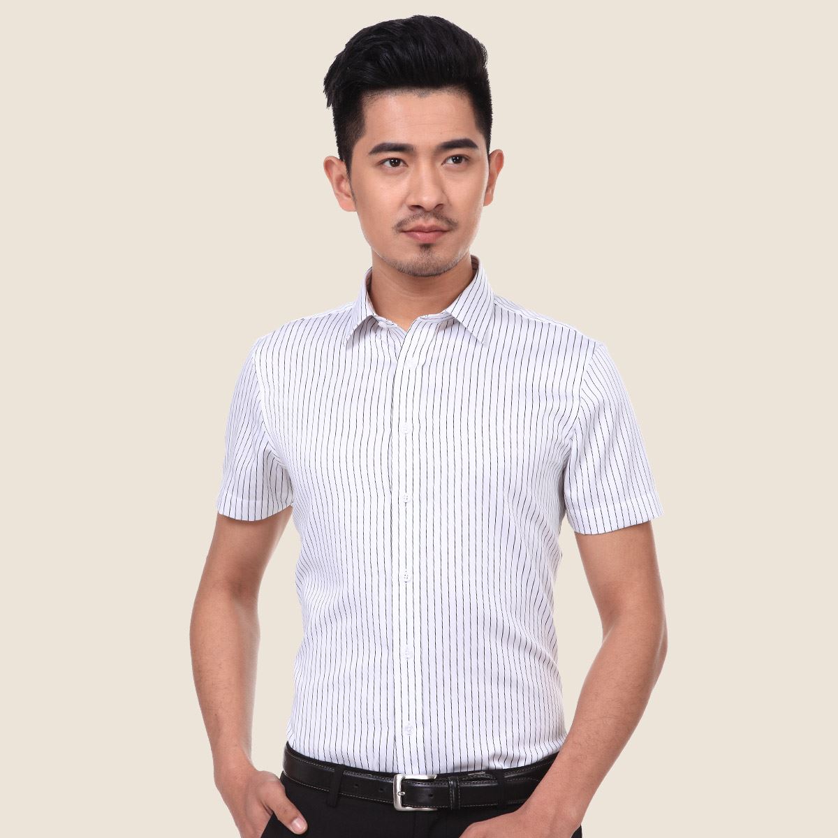 / 深海夏裝新款男士短袖襯衫男韓版修身絲光棉條紋黑白商務休閑